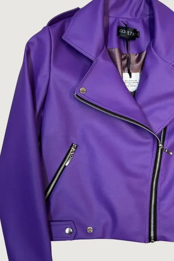 Biker jacket, en corte clásico, totalmente forrada, con bolsillos laterales y bolsillo interno, herrajes grabados. Color Morado. Nota importante: Nuestras prendas están elaboradas en piel sintética de alta calidad. Debido a las características propias de este material, pueden presentarse ligeras variaciones en el color, textura, brillo u opacidad entre una prenda y otra. Estos detalles hacen que cada pieza sea única y no afectan su durabilidad ni estilo.