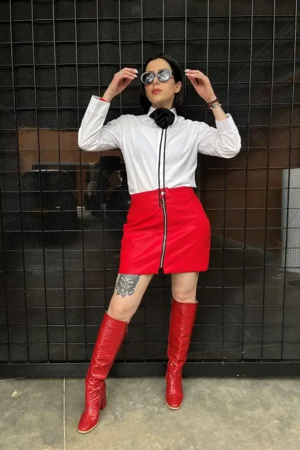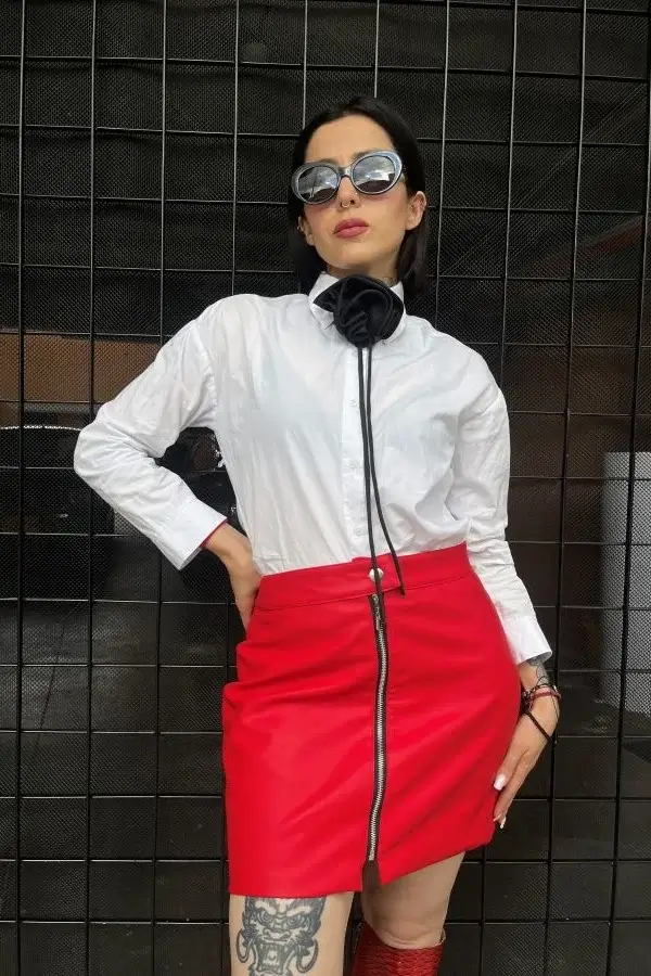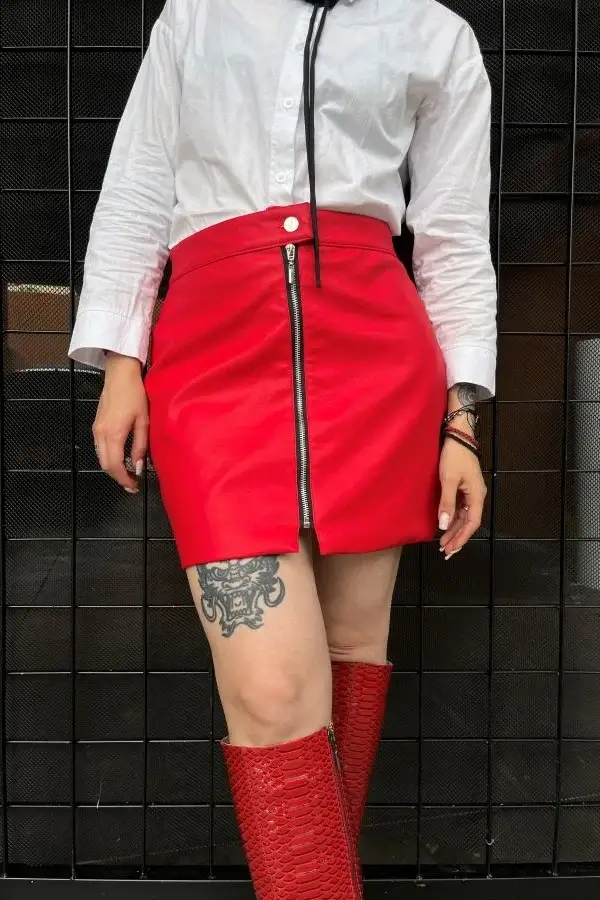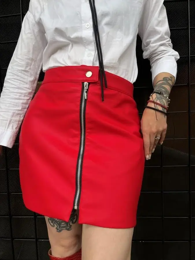 Mini falda en cuero vegano color rojo vivo, con cremallera frontal marcada, y totalmente forrada, silueta ajustada. Nota importante: Nuestras prendas están elaboradas en piel sintética de alta calidad. Debido a las características propias de este material, pueden presentarse ligeras variaciones en el color, textura, brillo u opacidad entre una prenda y otra. Estos detalles hacen que cada pieza sea única y no afectan su durabilidad ni estilo.