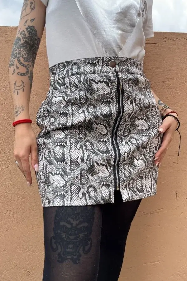 Mini falda en cuero vegano con estampado en pitón, con cremallera frontal marcada, y totalmente forrada, silueta ajustada. Nota importante: Nuestras prendas están elaboradas en piel sintética de alta calidad. Debido a las características propias de este material, pueden presentarse ligeras variaciones en el color, textura, brillo u opacidad entre una prenda y otra. Estos detalles hacen que cada pieza sea única y no afectan su durabilidad ni estilo.