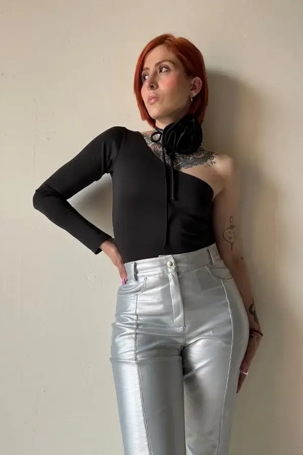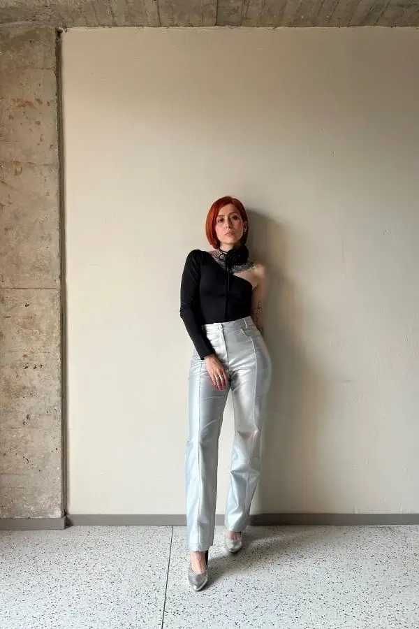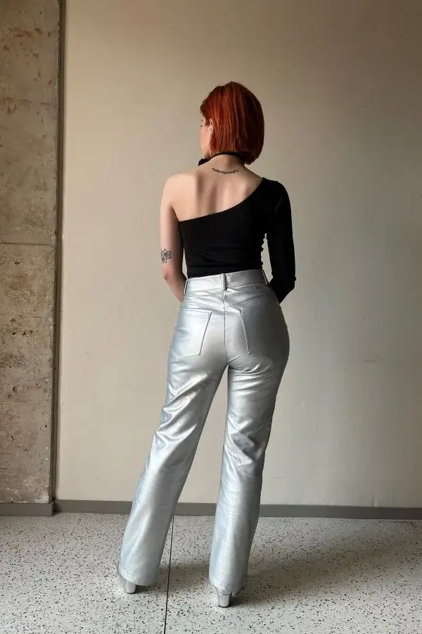 Pantalón elaborado en cuero vegano plateado, corte recto, con bolsillos posteriores y laterales, tiro alto, semi ajustado y vena o costura frontal. Nota importante: Nuestras prendas están elaboradas en piel sintética de alta calidad. Debido a las características propias de este material, pueden presentarse ligeras variaciones en el color, textura, brillo u opacidad entre una prenda y otra. Estos detalles hacen que cada pieza sea única y no afectan su durabilidad ni estilo.