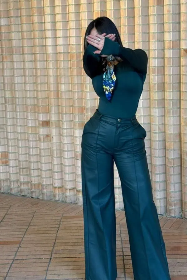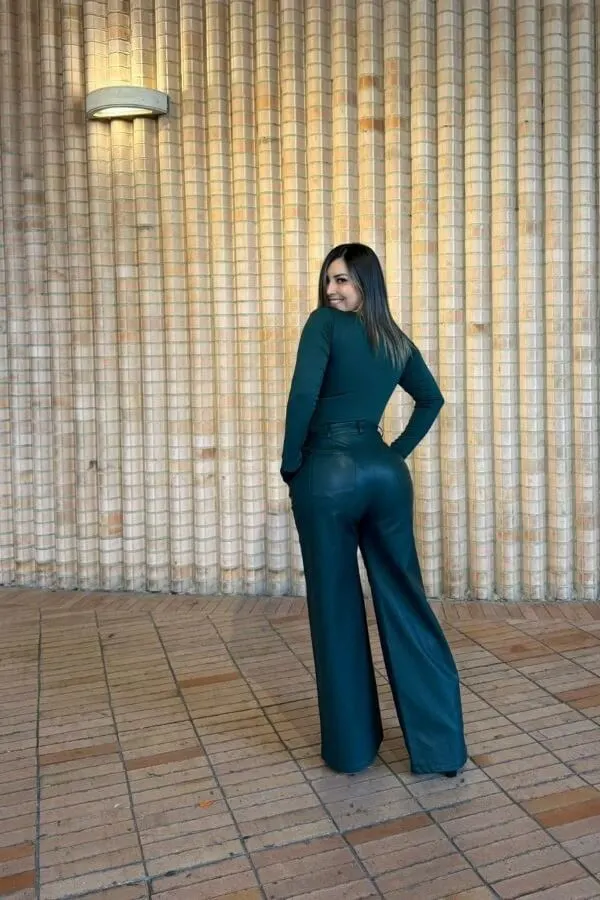 Pantalón tipo Palazzo, tiro alto, bota amplia, con bolsillos laterales y posteriores, elaborado en cuero vegano de alta calidad color verde botella. Nota importante: Nuestras prendas están elaboradas en piel sintética de alta calidad. Debido a las características propias de este material, pueden presentarse ligeras variaciones en el color, textura, brillo u opacidad entre una prenda y otra. Estos detalles hacen que cada pieza sea única y no afectan su durabilidad ni estilo.