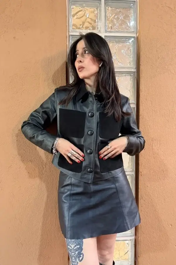 Chaqueta en corte clásico, elaborada en una combinación de cuero y gamuza100% legítimos, cuenta con doble bolsillo interno, cuatro bolsillos exteriores, totalmente forrada. Esta prenda al estar elaborada en piel legítima y debido a las características propias de este material, puede presentar ligeras variaciones en el color, textura, brillo u opacidad entre una prenda y otra. Estos detalles hacen que cada pieza sea única y no afectan su durabilidad ni estilo.