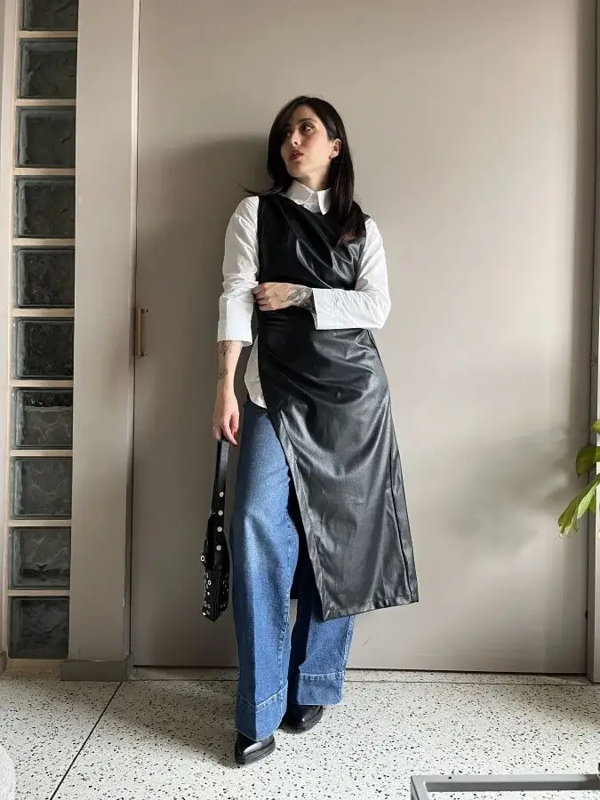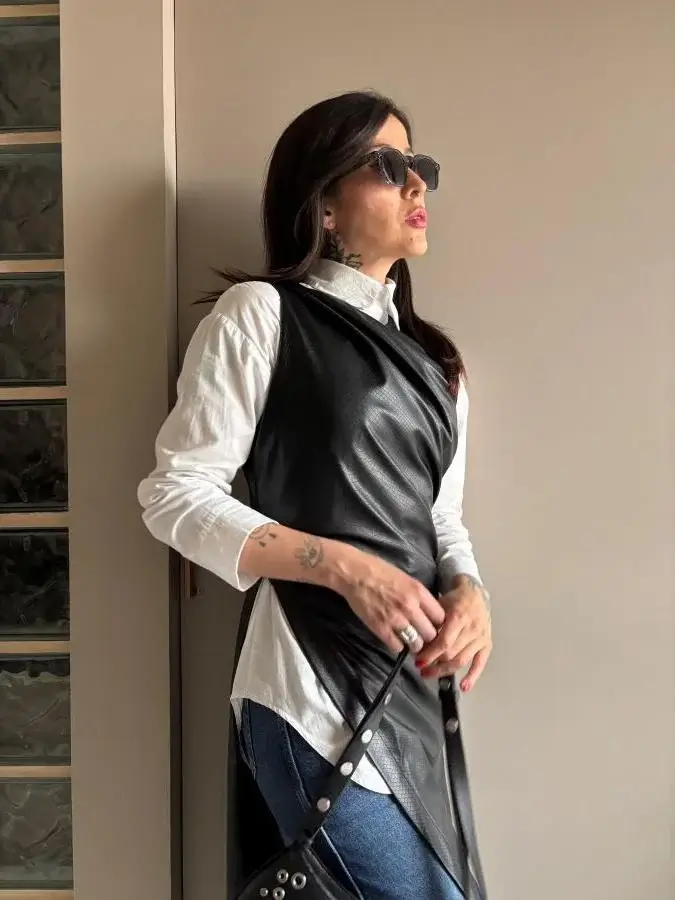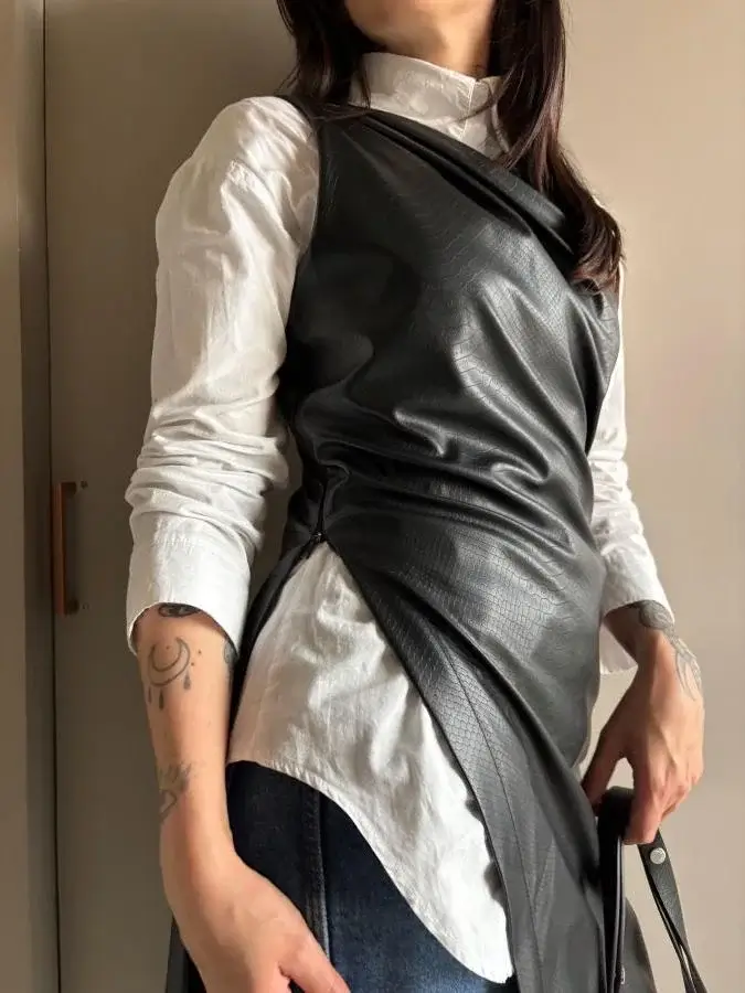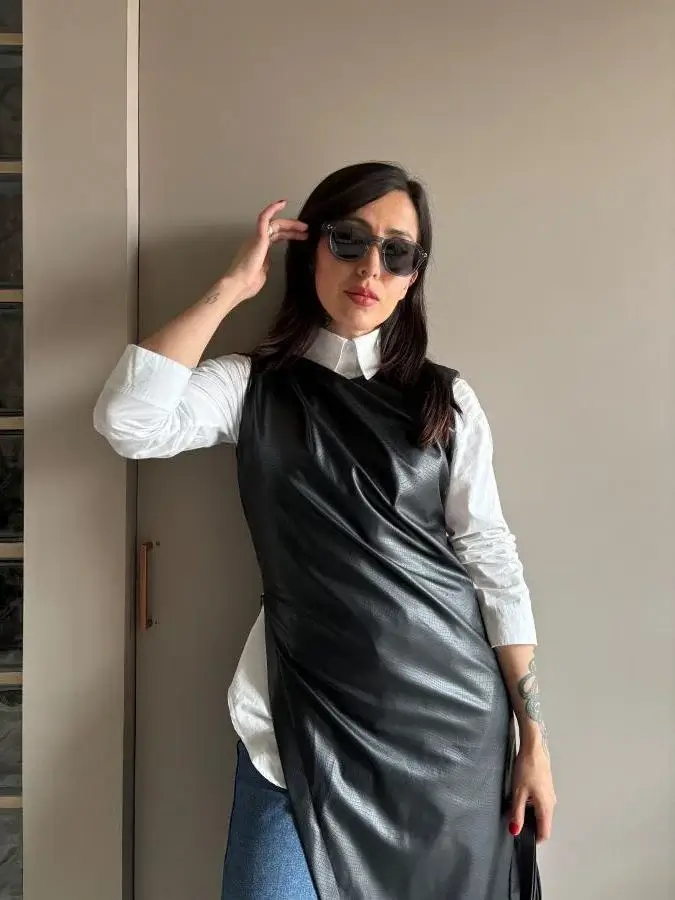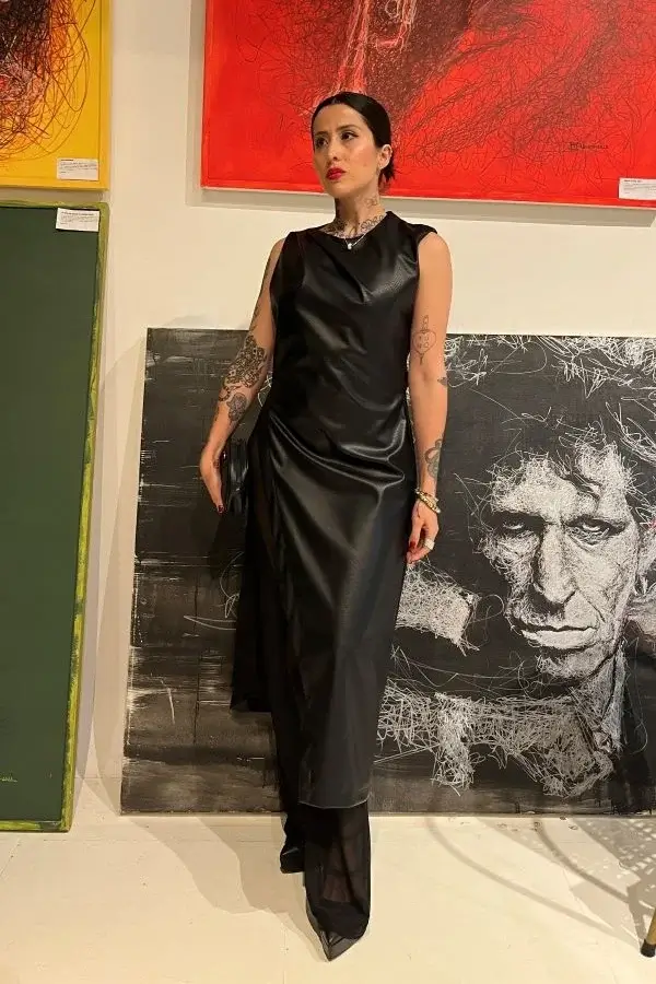 Set de 2 piezas, vestido sin mangas elaborado en cuero vegano con textura piton, color negro, con drapeado en el hombro, cremallera lateral, acompañado por un pantalón tiro alto corte amplio en mesh negra. Nota importante: Nuestras prendas están elaboradas en piel sintética de alta calidad. Debido a las características propias de este material, pueden presentarse ligeras variaciones en el color, textura, brillo u opacidad entre una prenda y otra. Estos detalles hacen que cada pieza sea única y no afectan su durabilidad ni estilo.